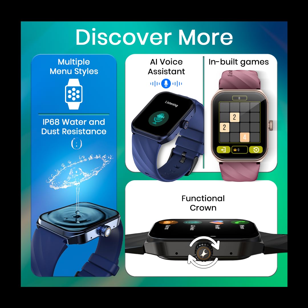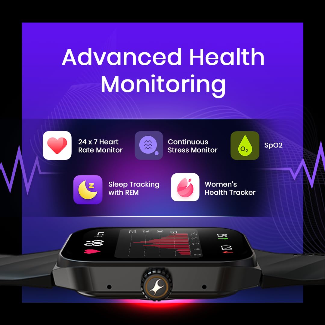 - NitroFast Charging, AI Voice Asistance, Advanced 100+ Cloud Watchfaces, Multisport, Up to 5 day battery, IP68 Water Resistance and many more handy features at a single tap; Health Monitoring with Stress monitor, 24x7 HRM, SPO2 ,Women's Health