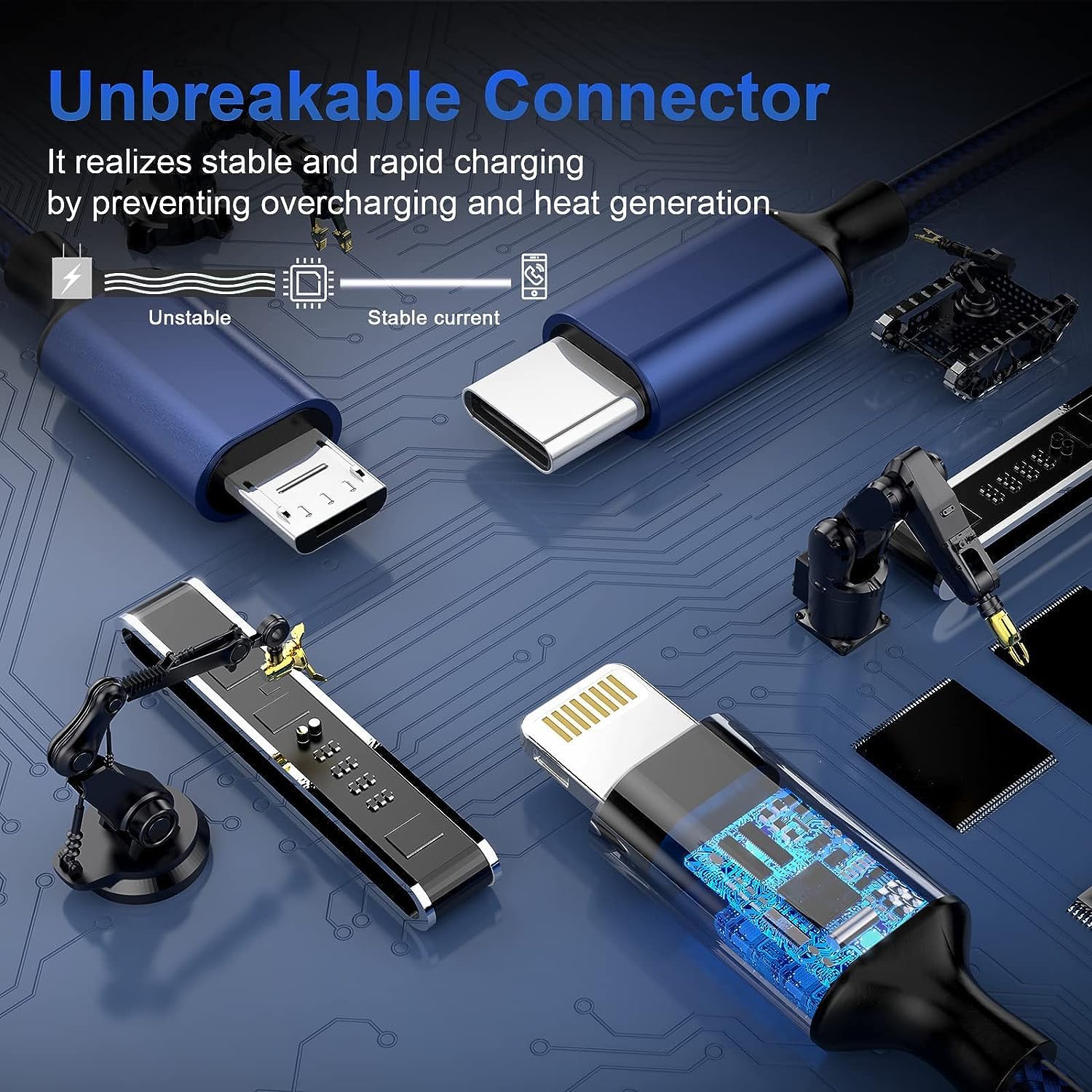 - 3in 1 charging cable with Robustic Design, the super purity copper conductor ensures high quality and safe charging. Resist high pressure with excellent design